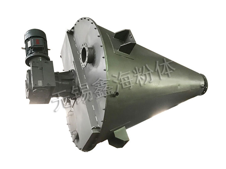 由于雙螺旋的公轉而使粉體沿著錐體壁作圓周運動。螺旋葉片的自轉,使粉體向錐體中央排放作徑向運動。粉體自錐體向上升流及螺旋外圓周表面上排出,即螺旋軸方向混合。螺旋在混合機內公轉,自轉的組合,造成了粉體的四種流動形式,也就是對流,剪切,擴散,滲合的復合運動。因此粉體物料在這種混合機內能迅速達到均勻的混合。