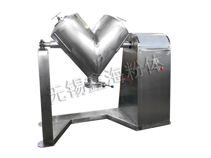 V型混合機一端裝有電機與減速機,電機功率通過皮帶傳給減速機,減速機再通過聯軸器傳給V型桶。使V型桶連續運轉,帶動桶內物料在桶內上、下、左、右進行混合。