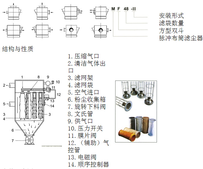 含塵氣流從進氣口進入下箱體后,部分沉降,輕微粉塵浮動時被濾袋阻留,凈化空氣透過濾袋,經(jīng)文氏管進入上箱體,從出氣口排出。
